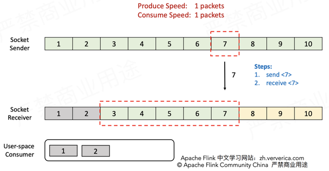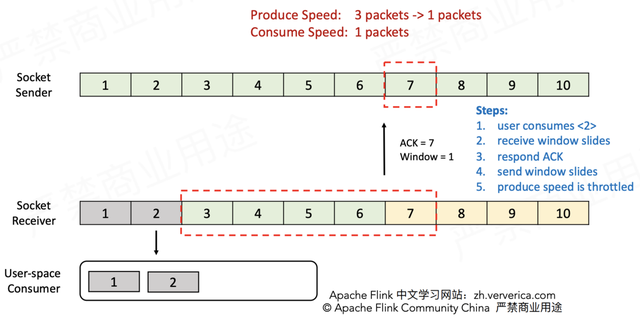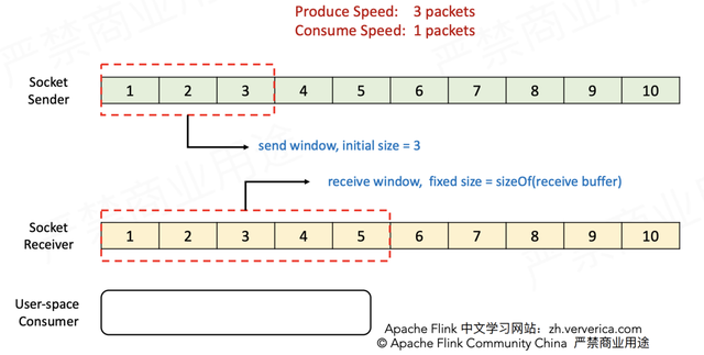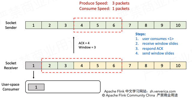 在1.5版本之前,Flink并没有特别地去实现自己的流控机制,而是在传输层直接依靠TCP协议自身具备的滑动窗口机制(大学计算机网络课程必讲)。下面通过实例来复习TCP滑动窗口是如何实现流控的。