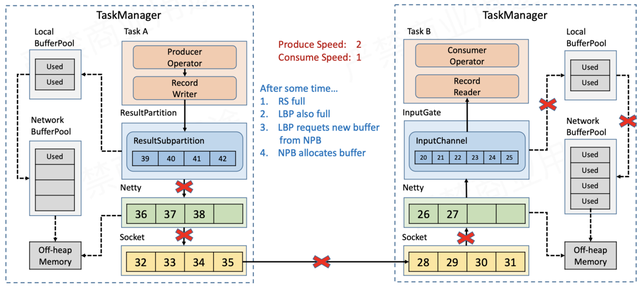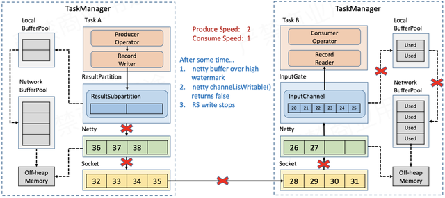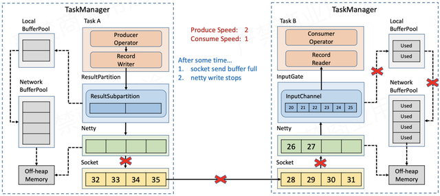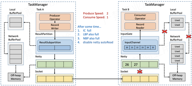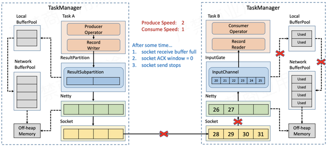 随着数据不断积压,NetworkBufferPool的额度也会被耗尽,此时没有空间再接收新的数据,Netty的auto read会被关闭,不再从Socket缓存读取数据。