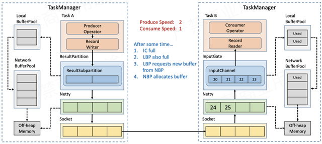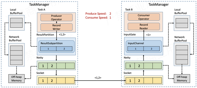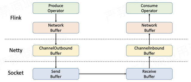 Sender在发送数据时,首先写入TaskManager内部的网络缓存,利用Netty进行传输——将待发送的数据存入Netty的ChannelOutboundBuffer,再经由Socket的发送缓存发送出去。Receiver在接收数据时是反过来的,同样要经过3层缓存,即Socket接收缓存→Netty ChannelInboundBuffer→TaskManager网络缓存。要实现流量控制,就是在上面的流程上做文章。