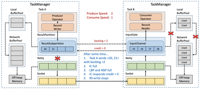 随着Receiver端的数据不断积压,网络缓存最终被耗尽,因此会反馈给上游credit = 0(相当于TCP滑动窗口中的window = 0),Sender端ResultPartition到Netty的链路会被阻断。按照上一节所述的流程,Sender端的网络缓存会被更快地耗尽,RecordWriter不能再写数据,从而达到反压的效果。