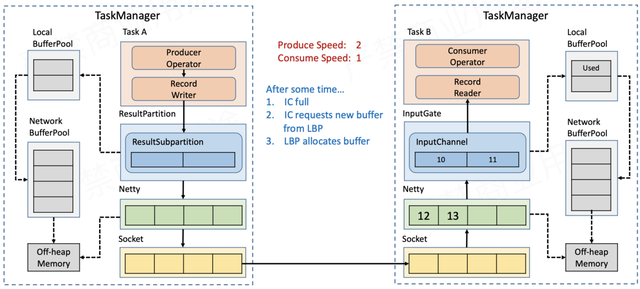 一段时间过后,Receiver端InputChannel本身的缓存被耗尽,因此会向本地缓存池LocalBufferPool申请新的缓存。