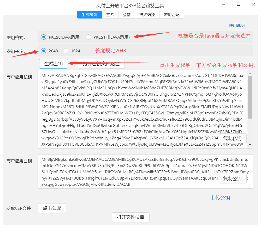 5、通过支付宝秘钥生成器获得商户密钥对。