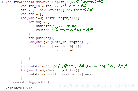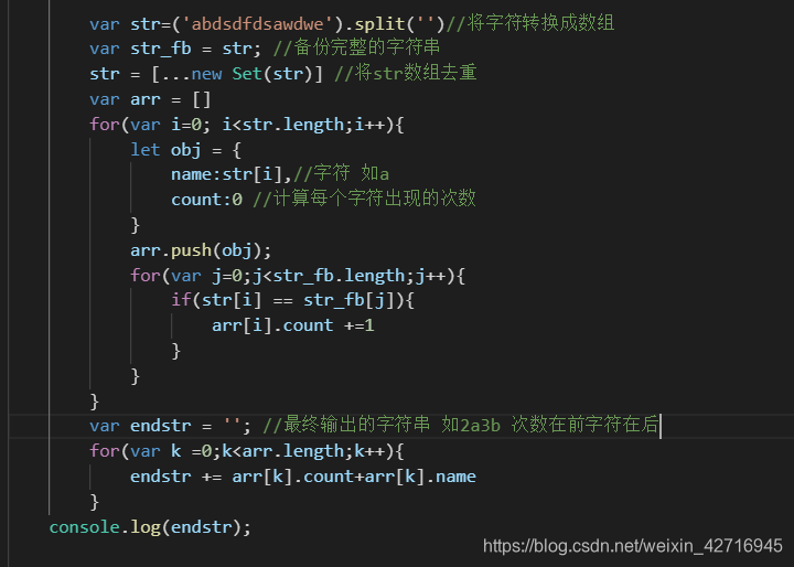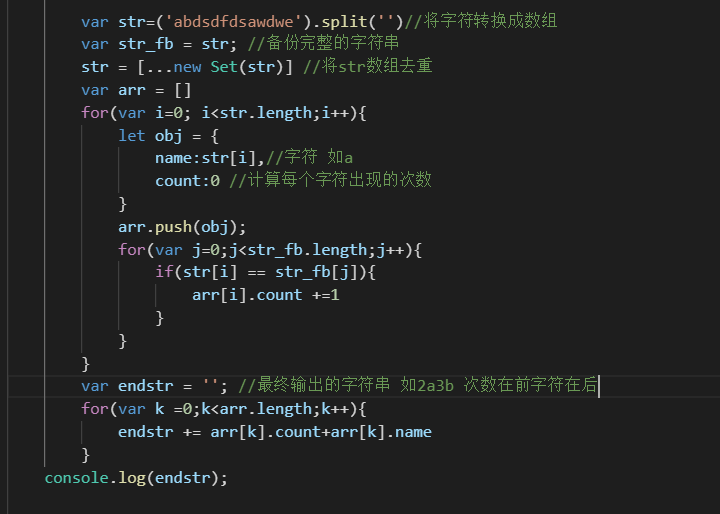 JavaScript 计算一串字符里 每个字符出现的次数 并打印输出 如2a3b... 2为a出现的次数 3为b出现的次数