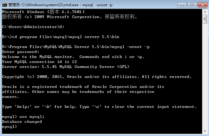 出现 Database changed 就对了,接下来就要开始设置密码了。