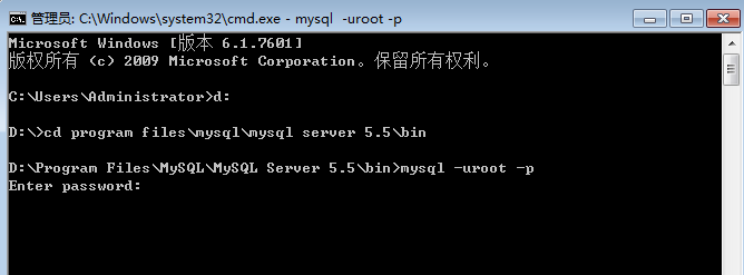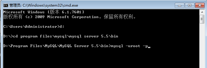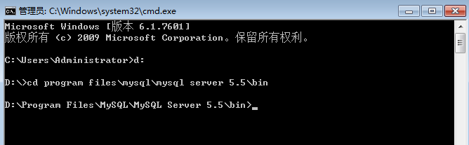 1. 先找到mysql的安装目录,本机安装的目录是D:\Program Files\MySQL\MySQL Server 5.5\bin\。