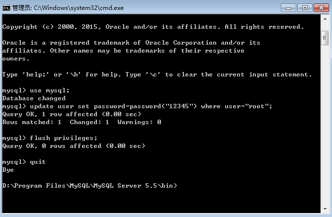 到此为止,密码已经修改并生效了,但是还需要测试一下,所以我们再输入 quit 并回车,先退出mysql