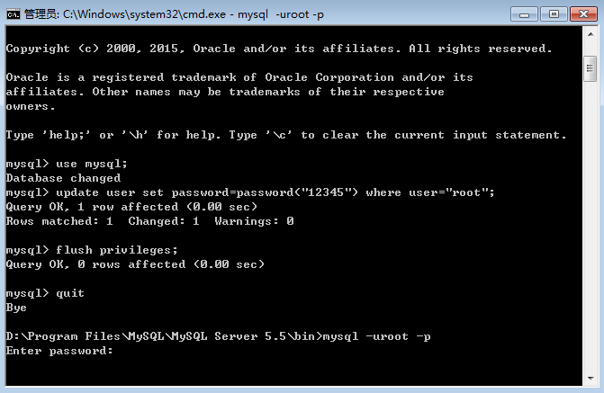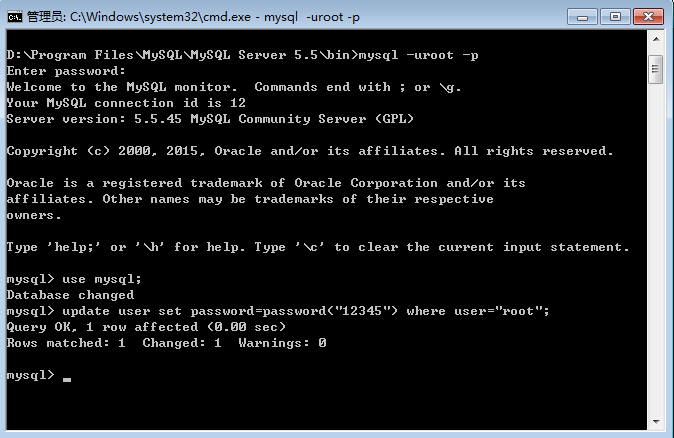 7. 输入 update user set password=password("这里填写要设置的密码") where user="root";