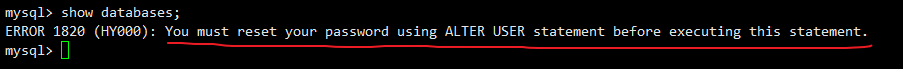 此时不能做任何事情,因为MySQL默认必须修改密码之后才能操作数据库: