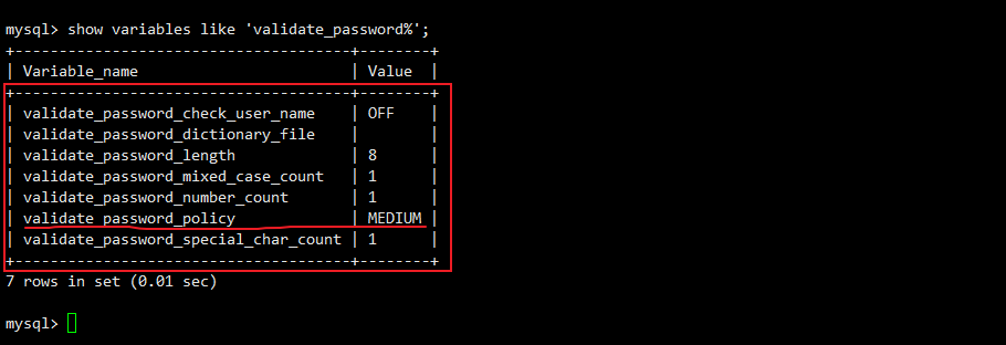 - validate_password_policy:密码策略,默认为MEDIUM策略。