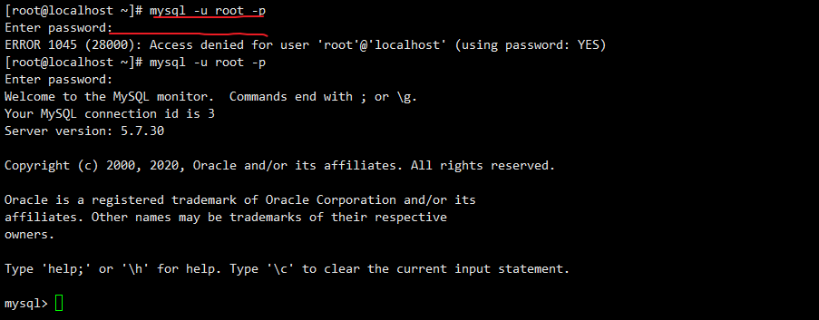 mysql -u root -p123456 #带密码登录(注意-p后面不要空格),这里密码还没有设置完成