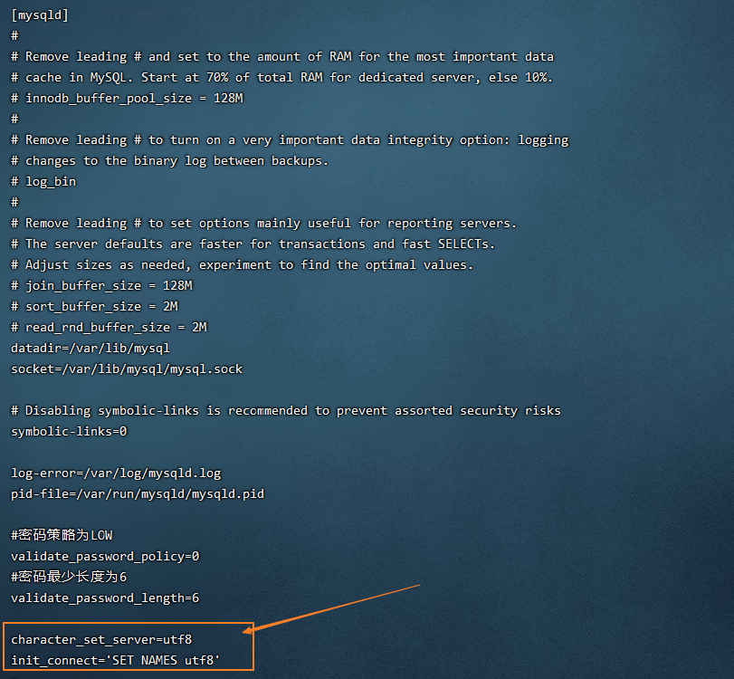 [1]、修改/etc/my.cnf配置文件,在[mysqld]的最下面添加编码配置,如下所示: