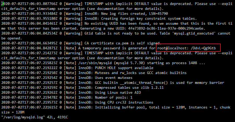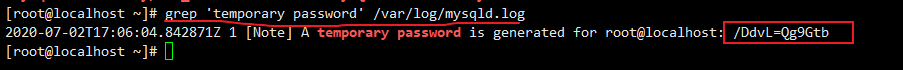 MySQL安装完成之后,第一次启动后会创建超级管理员账号root@localhost,在/var/log/mysqld.log文件中给root生成了一个临时的默认密码。我们可以使用如下命令查找: