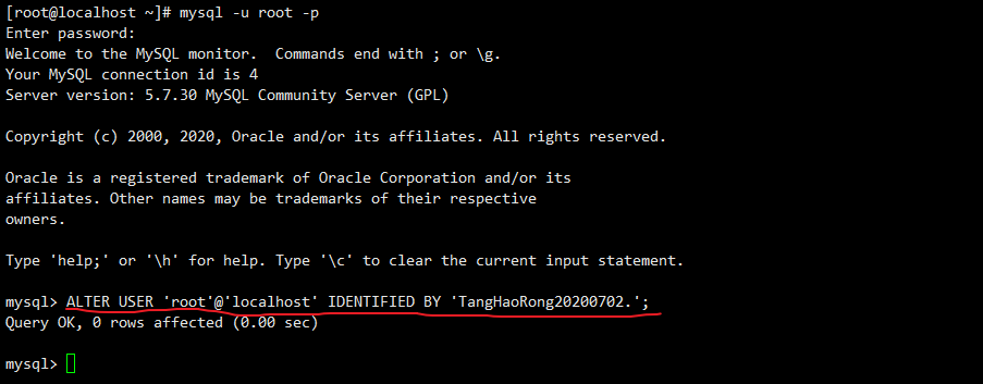 ALTER USER 'root'@'localhost' IDENTIFIED BY 'TangHaoRong20200703.';