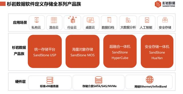 产品线的不同,只是解决用户实际应用场景的需求不同。不过,一旦聚焦用户应用场景的数据变化,匹配更贴身的软件定义存储方案,这样的思路最终让杉岩数据的产品策略实现了一定的分层,主要聚焦硬件基础架构层、自身的软件定义存储层和应用软件层。