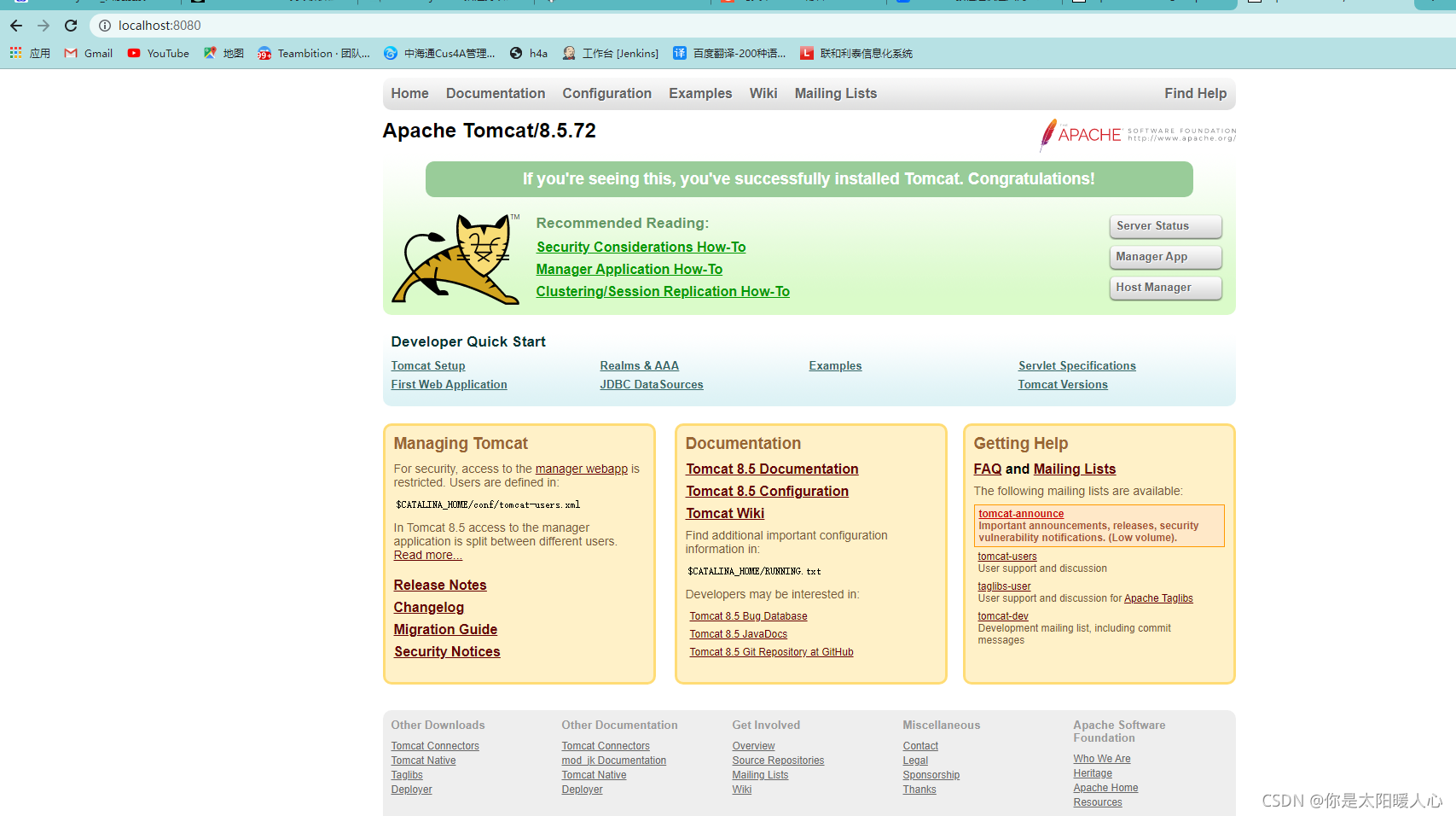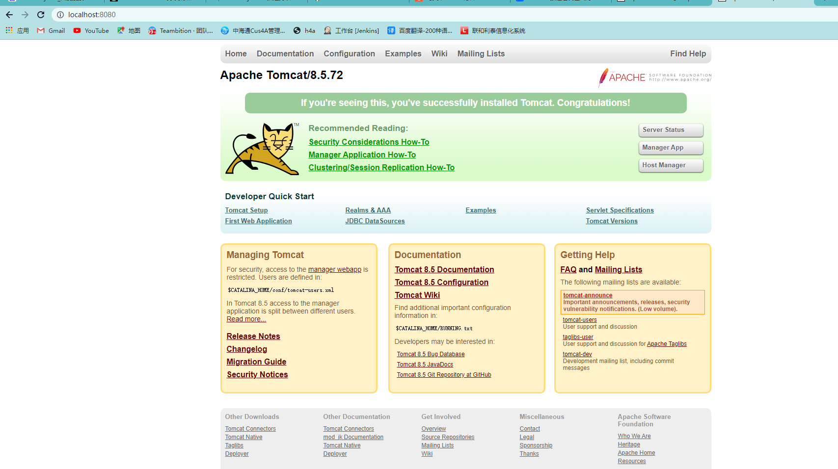 此时在浏览器中输入:localhost:8080,进入该8080端口页面,如果能成功加载该页面,则证明Tomcat安装有效。
