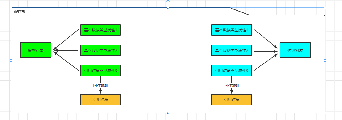 深拷贝:不管原型对象属性是简单数据类型还是引用对象类型都会完全的复制一份到新的对象中。两个对象之间互不影响。