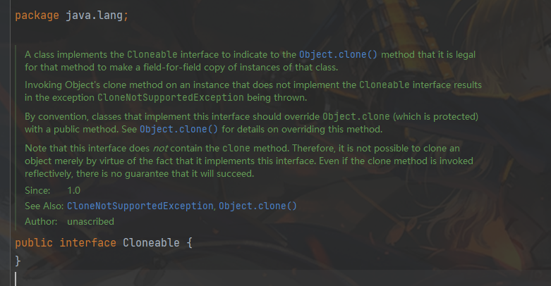 Java提供了一个标记接口——Cloneable,实现该接口完成标记,在JVM中具有这个标记的对象才有可能被拷贝。如果不实现该接口,克隆对象会抛出CloneNotSupportedException异常。