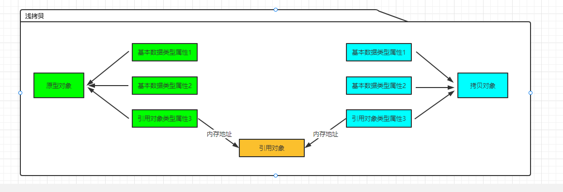 浅拷贝:当拷贝对象包含基本数据类型(如int、long)或者不可变的对象(如字符串、基本类型的包装类)时,会直接将这些属性复制到新的对象中。而原型对象中的引用对象会把内存中的地址复制给克隆对象。此时,两个对象共享了一个私有变量,你改我改大家都能改。