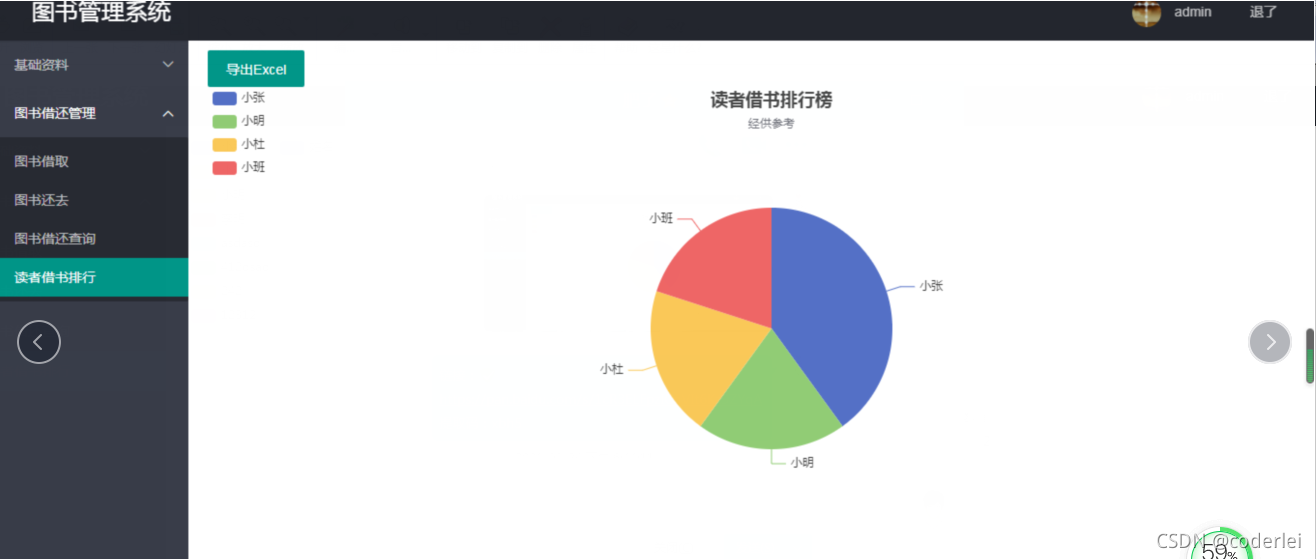 4.读者借书排行榜:在这里可以图形化看到当前借书排行榜,导出Excel