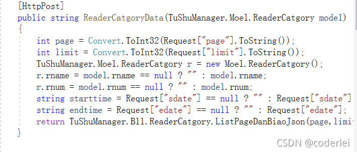 技术点主要是基本逻辑各表的增删改查和判断修改增加,多表查询,数据渲染,显示高亮,图片上传,图表显示,导出Excel等。代码首先是搭好框架包括MODEL,BLL,DAL,common,DBunitily,把所有需要增删改查的表写入到这个框架里面,搭建好后我们只要在使用MVC模式中的control和view读取就可以了,control和view代码量大大减少,例如: