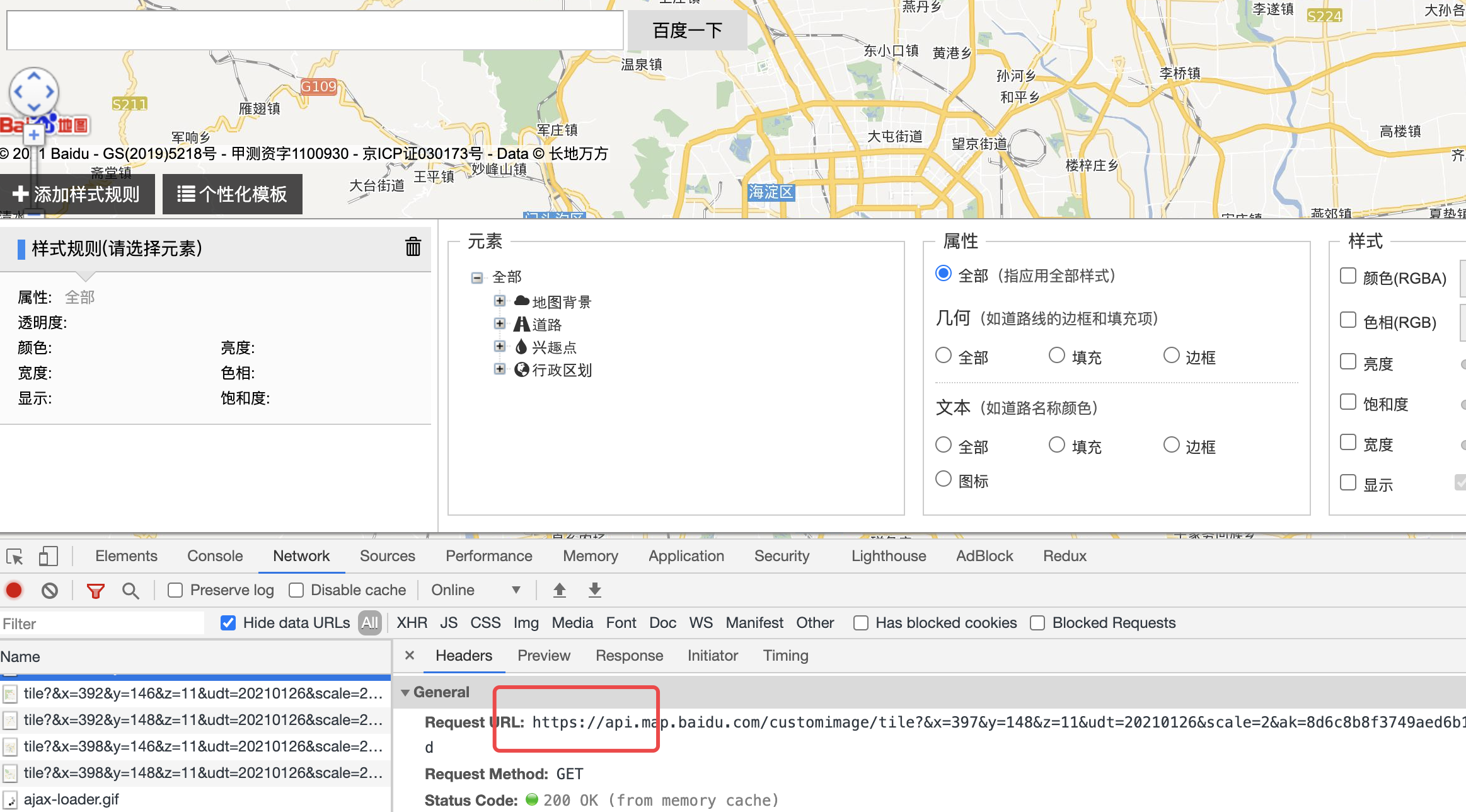 4. 查看旧版 百度地图个性编辑,查看底图请求,终于找到想要的结果,如下图