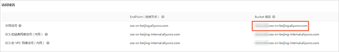 - 存储空间概览页的访问域名区域查看Bucket域名。