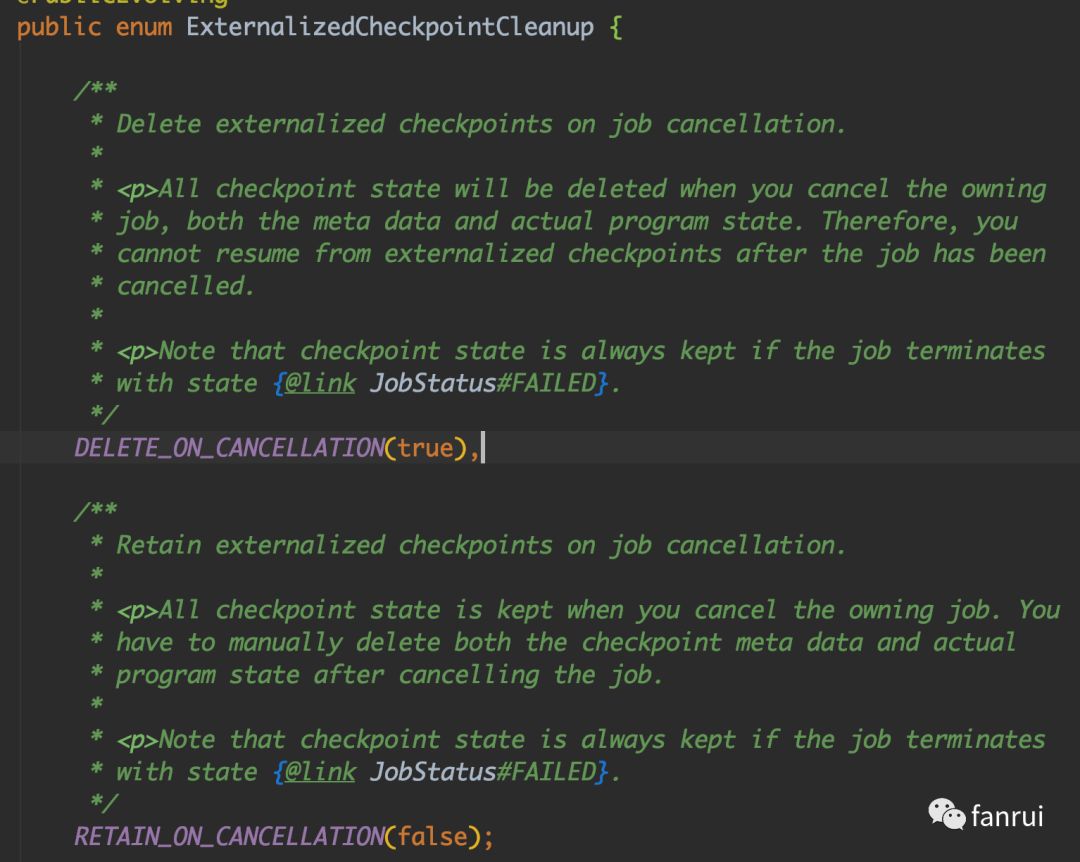 参数有两种枚举,分别是:ExternalizedCheckpointCleanup.DELETE_ON_CANCELLATION 和 ExternalizedCheckpointCleanup.DELETE_ON_CANCELLATION。这两种枚举分别代表什么含义呢?看一下源码中的解释: