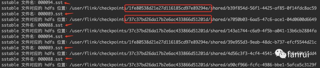 上述代码解析的是 jobId 为 1fe80538d21e27d116185cd97e89294e 任务的 Checkpoint 元数据信息,我们可以看到有很多的 sstable 文件,并且看到 sstable 文件既包含 jobId 为 1fe80538d21e27d116185cd97e89294e 的 Checkpoint 文件,也包含 jobId 为 37c37bd26da17b2e6ac433866d51201d 的 Checkpoint 文件,也就是说依赖了之前 job 的 Checkpoint 数据。所以 jobId 为 37c37bd26da17b2e6ac433866d51201d 的任务虽然结束了,但是由于后续任务还依赖它的 Checkpoint 信息,所以不能删除它的 Checkpoint 信息。