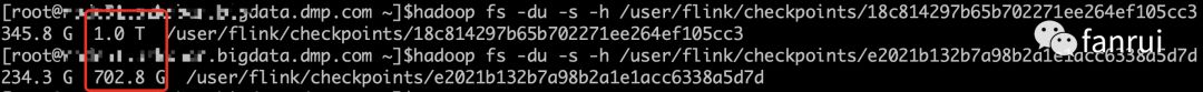 假设任务运行对应的 jobId 为 A,job A 停止且重启后对应的 jobId 为 B,此时 A 对应的 Checkpoint 可能已经没用了,可以将其清理掉从而节省 hdfs 的存储空间。同学们可能想,不清理可以吗?当然可以,但是如果一直不清理就会占用 hdfs 存储空间。下图是笔者生产环境中两个状态比较大的任务,第一个任务的状态信息在 hdfs 三副本总共占用了 1 T,第二个任务的状态信息在 hdfs 三副本中总共占用了 700G。如果 Flink 任务经常重启,那么这些大状态的任务将会在 Checkpoint 目录下对应很多个 job 目录,将会把大状态任务存储很多份。假如 1 T 的任务保存了 5 份,那就是占用 5 T 的磁盘空间,但其实只需要保存一份全量数据就够了。因此必须有定期清理 Checkpoint 目录的策略。