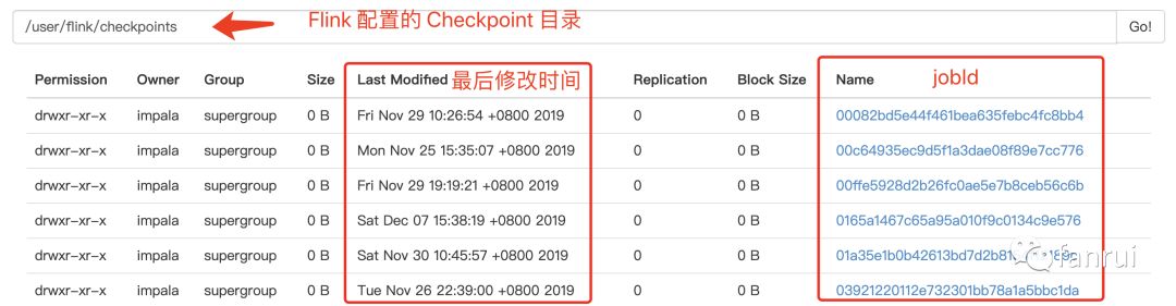 如下图所示,Flink 中配置了 Checkpoint 目录为:/user/flink/checkpoints,子目录名为 jobId 名。hdfs 的 api 可以拿到 jobId 目录最后修改的时间。对于一个正在运行的 Flink 任务,每次 Checkpoint 时 jobId 的 Checkpoint 目录最后修改时间会更新为当前时间。可以认为如果 jobId 对应的最后修改时间是 10 天之前,意味着这个 job 已经十天没有运行了。