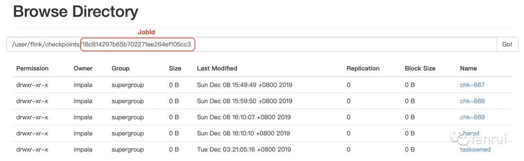 请注意一个重点,上述两个 hdfs 的目录不一样。简单描述故障现象是这样的:任务从 job A 的 Checkpoint 目录恢复,恢复后的 jobId 为 B,job B 并没有正常恢复,报错信息为在 hdfs 目录找不到 job C 的 Checkpoint 信息。解决问题的过程中是完全蒙的,手动去 hdfs 确认,发现 job A 的 Checkpoint 目录是存在的,非常纳闷:我的要从 job A 的 Checkpoint 处恢复任务,Flink 为什么要找 job C 的 Checkpoint 目录?甚至还怀疑是不是 hdfs 出问题了。。。摸爬滚打了一个小时,没找到根本原因,为了不发生事故,最后没有将任务从 Checkpoint 处恢复,选择了直接重启的方式。