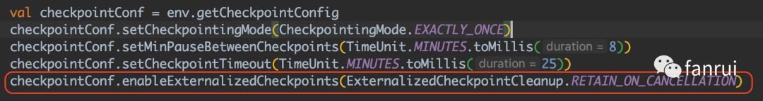 如下图所示,红圈处的一行配置 env.getCheckpointConfig().enableExternalizedCheckpoints() 表示当 Flink 任务取消时,是否保留外部保存的 CheckPoint 信息。