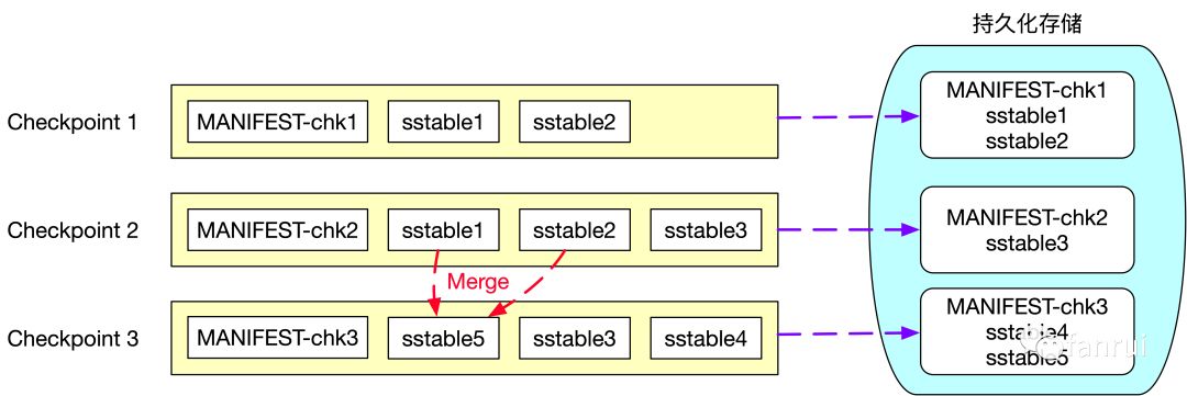 基于 LSM Tree 实现的数据库为了提高查询效率,都需要定期对磁盘上多个 sstable 文件进行合并操作,合并时会将删除的、过期的以及旧版本的数据进行清理,从而降低 sstable 文件的总大小。图中可以看到第三次 Checkpoint 时生成的快照信息为sstable3、sstable4、sstable5 及元数据文件 MANIFEST-chk3, 其中新增了 sstable4 文件且 sstable1 和 sstable2 文件合并成 sstable5 文件,因此第三次 Checkpoint 时只需要向外部持久化存储上传 sstable4、sstable5 及元数据文件 MANIFEST-chk3。