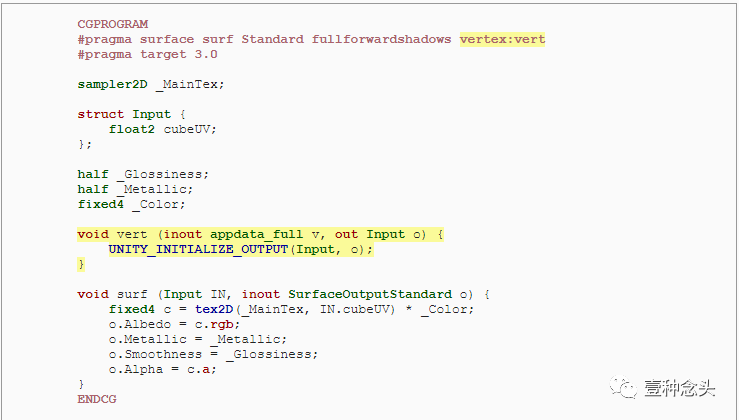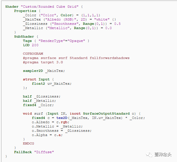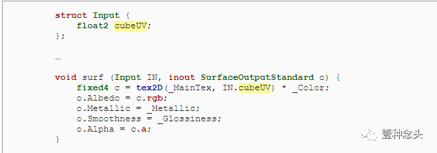 这是默认的表面着色器。主要的一点是它定义了一个输入结构,并且期望传入主纹理的坐标。在surf函数中使用这些坐标,以便让每个呈现的片段都能调用它。