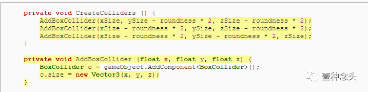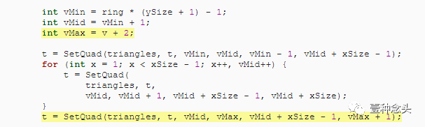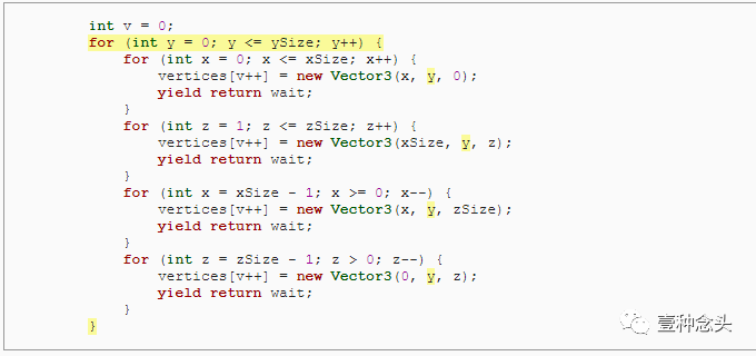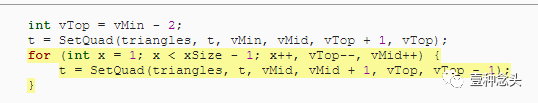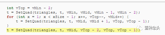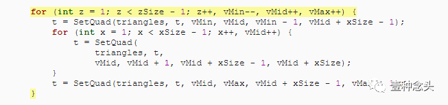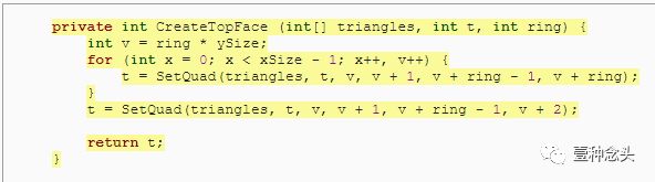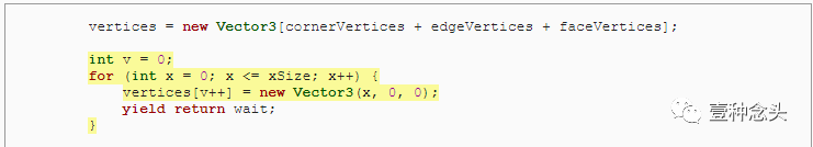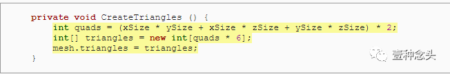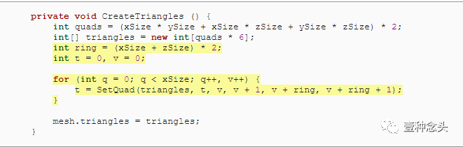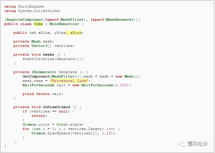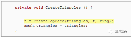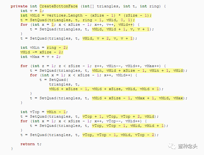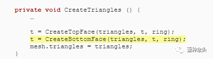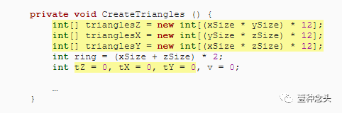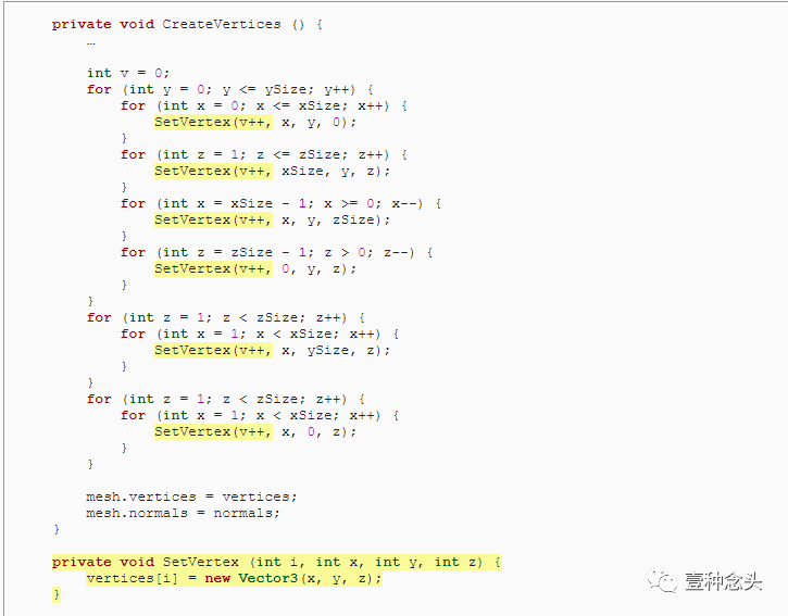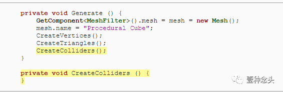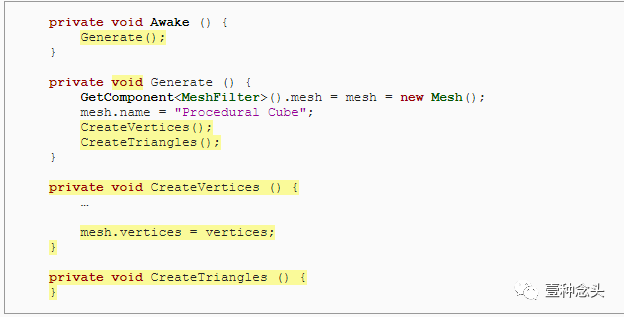 为了准备这个,和前面教程一样,我们可以删除协程的内,并添加了创建顶点和三角形的单独方法。当然,顶点需要赋值到mesh里。