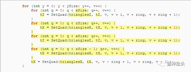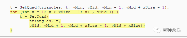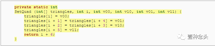 虽然我们给立方体对象的是一个 vertices 字段,但是对于三角形而言,不能这么做。因此,我们必须将它作为参数传递给SetQuad方法。这就是为什么这个方法可以是静态的。当然,其实你也可以在对象级别存储三角形,但请注意,后面要用的是传参数的方法。