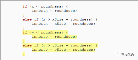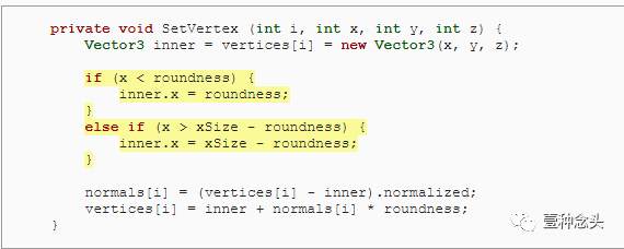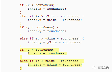 接下来我们要找出内在的点。首先检查X坐标。如果它小于圆度,那么它在内部立方体的左边,内部的X坐标就是圆度值。如果超出了立方体的X减去圆度值的大小,那么就在右边。除了这两种情况之外,内外的两个点共享相同的X坐标。