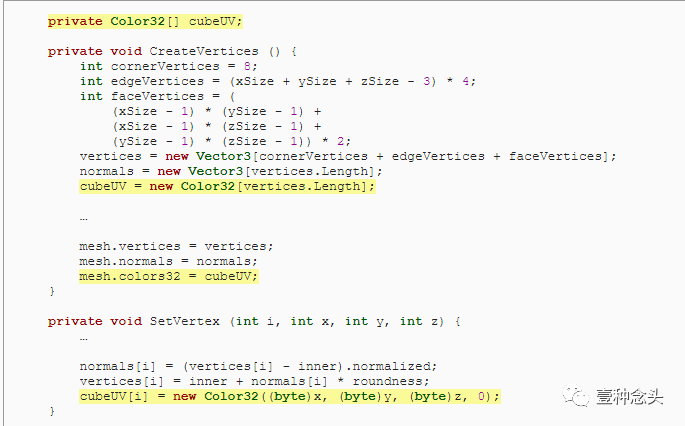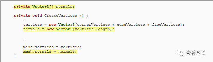 还记得之前让Unity自动计算的法线吗?这一次我们一样可以让Unity自己来计算。但是,Unity计算出来的是一个平均值,可能与我们想要的圆角度的表现不太契合,所以这次我们就自己来计算法线,这样会得到更好的表现效果。那么第一步就是,先增加一个 normals 数组。