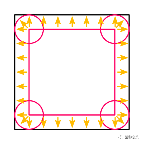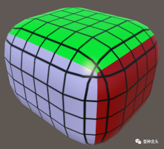 可以这样想象一下,有一个较小的立方体浮动在我们的原始立方体内。这两个立方体的面之间的距离就等于我们配置的圆度值。你可以想象一个球被贴在这个小立方体的角上,它们的半径等于刚才的圆度值,所以内部立方体被牢牢地固定在原地了。对于外部立方体上的任意一点,在内部立方体上有一个离它最近的点。这样我们就可以用它来确定圆角立方体的法线向量了。