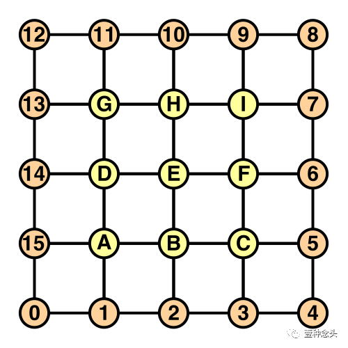 第一行遵循熟悉的模式。这是因为内部网格的第一行是在螺旋结束后直接添加的。但最后一个正方形的第四个顶点是不同的,因为那是环向上弯曲的地方。