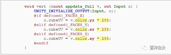 这里我们必须使用Color 32,而不是通常的Color类型,因为顶点颜色组件存储为一个字节。整个颜色是四个字节,大小与单个浮点数相同。如果我们使用常规颜色,那么Unity将从0-1浮点数转换为0-255字节,截断超出该范围的所有内容。通过自身直接转换为字节,我们可以处理高达255的多维数据集大小,这应该就足够了。在阴影方面,我们现在可以使用顶点的颜色,而不是它的位置。当着色器将顶点颜色通道解释为0-1范围内的值时,我们也必须通过乘以255来撤消这一转换才能得到正确的值。