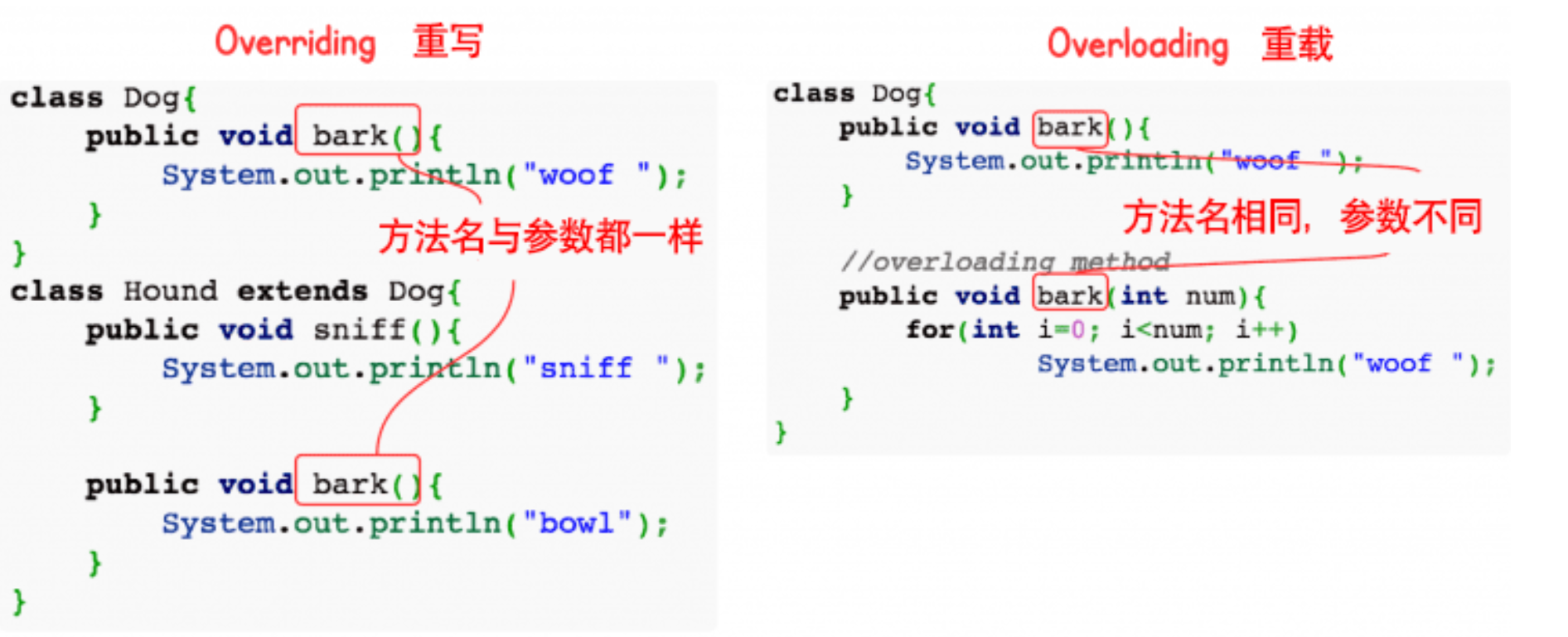 - (2)方法重写是在子类存在方法与父类的方法的名字相同,而且参数的个数与类型一样,返回值也一样的方法,就称为重写(Overriding)。