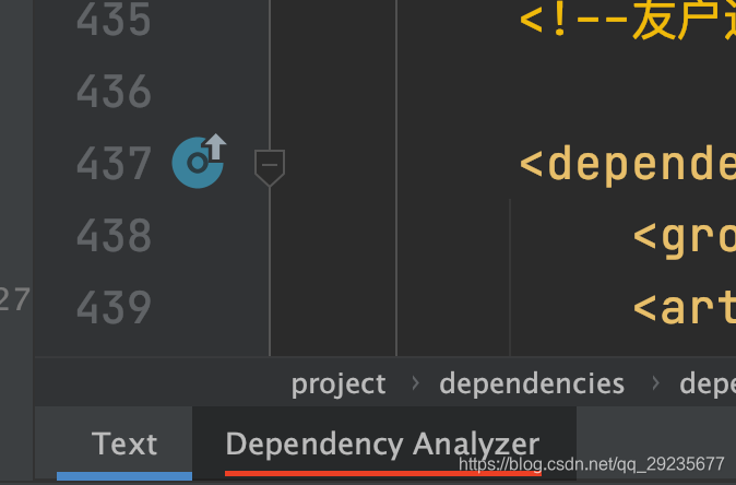 安装完成之后,需要重启项目插件才能够生效,按装完成的标准就是找到pom文件,在pom文件中看到 dependency analyzer标志,说明maven helper插件就安装成功了。