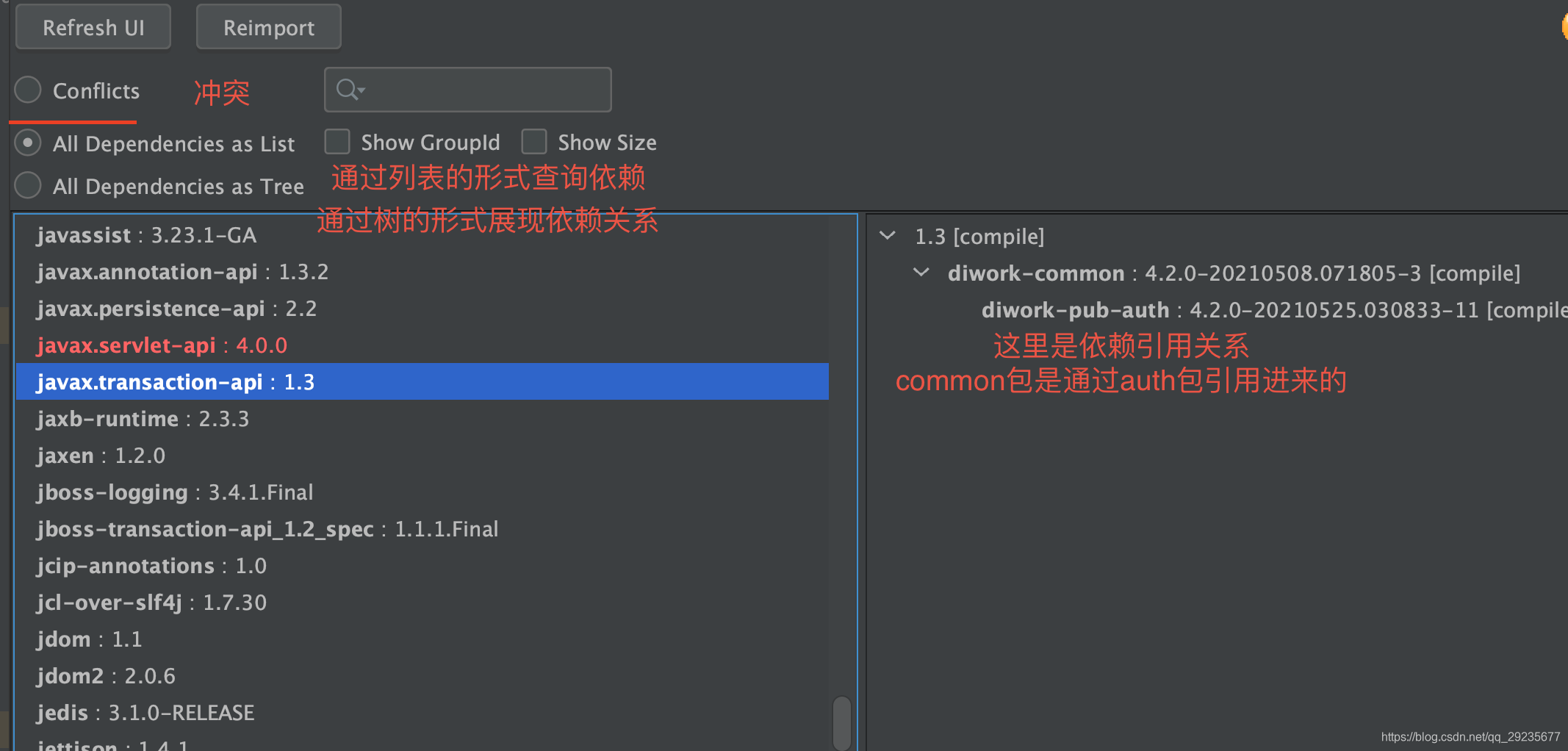 这里是List的形式展示的依赖关系,右侧展示了包的引用关系,通过diwork-pub-auth引用了diwork-common包,其中有半部分标红的就是冲突版本,白色的是当前的使用版本。