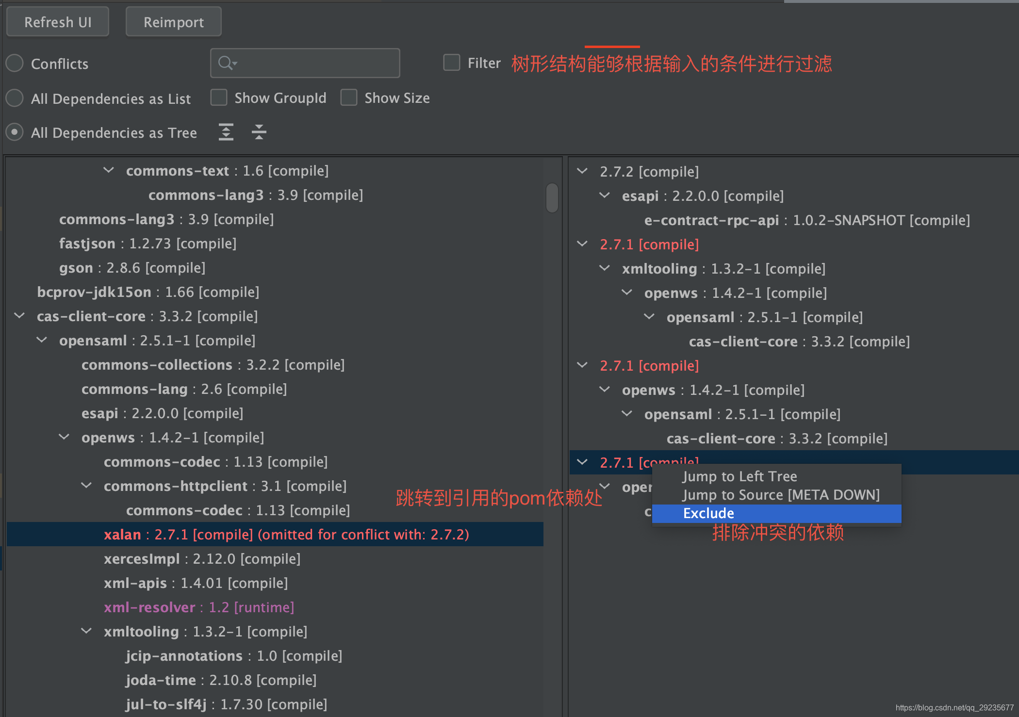 无论是树形结构还是list结构,标红的就是有冲突的包,当前界面的右侧部分2.7.2是当前使用的版本,下面飙红的2.7.1就是冲突的版本。通过右击可以把不想要的jar依赖排除,而不需要自己找到相应的pom文件,自己写exclude标签实现排除依赖,是不是很方便。