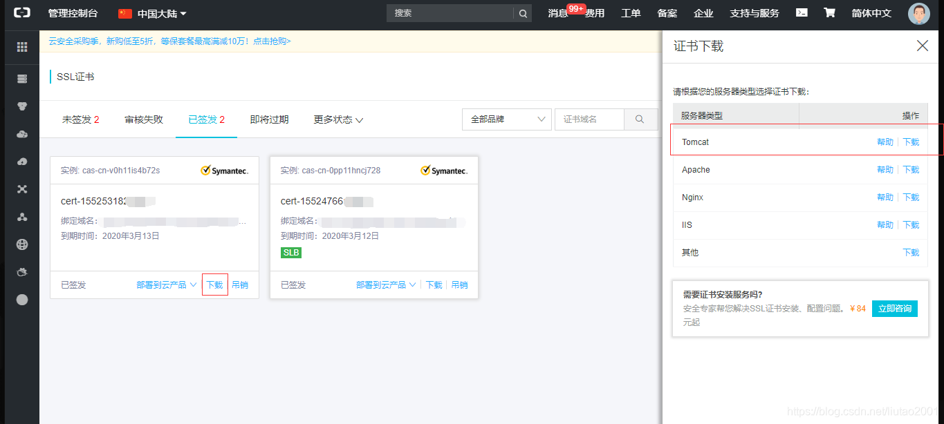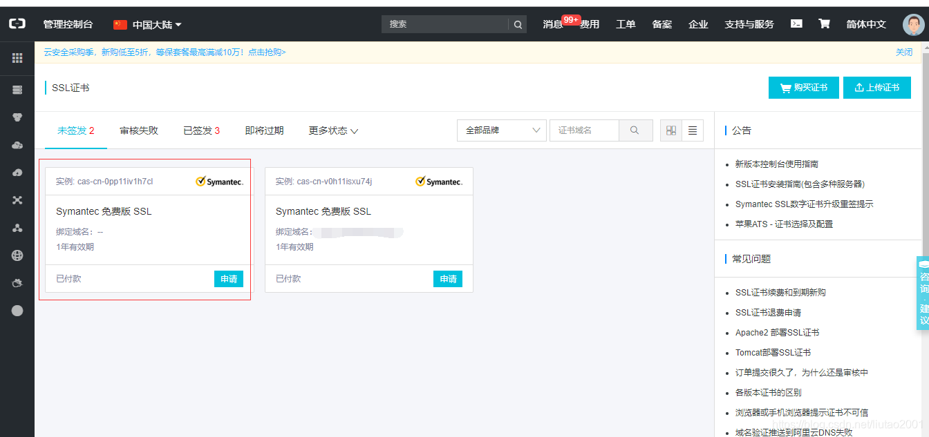 购买之后进入证书控制台,找到刚刚购买的证书点击申请