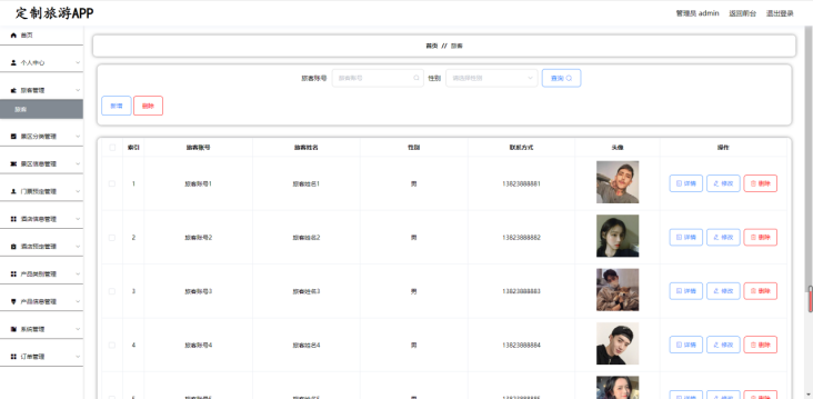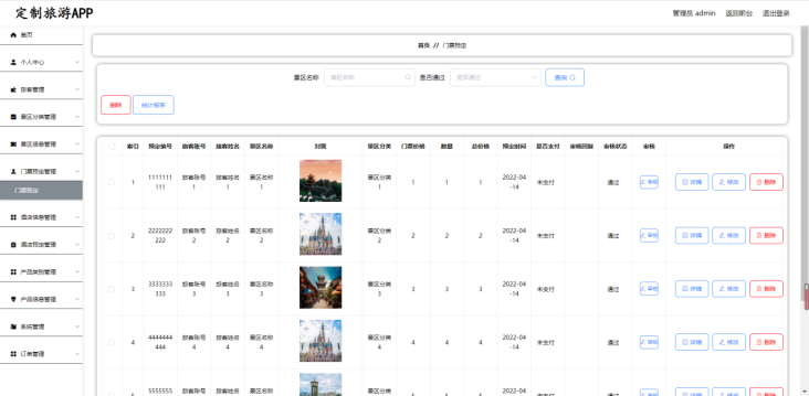 管理员:个人中心、旅客管理、景区分类管理、景区信息管理、门票预定管理、酒店信息管理、酒店预定管理、订单管理、系统管理等
