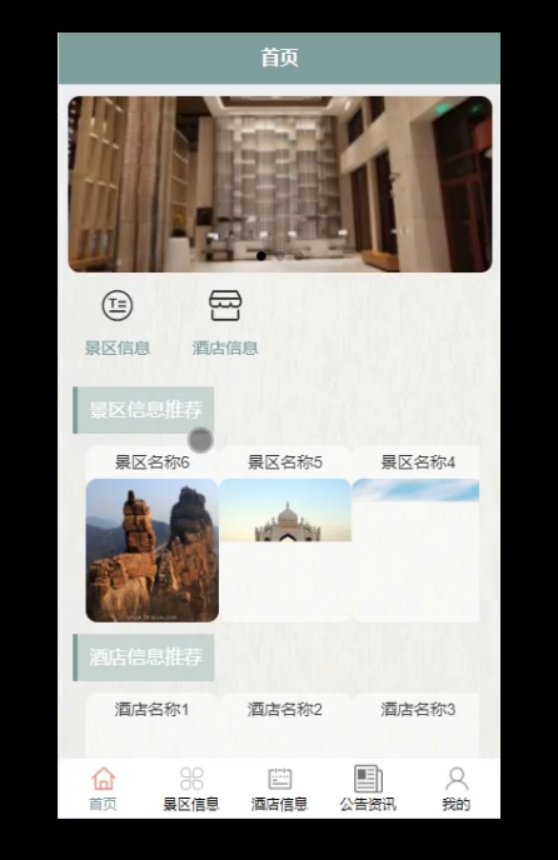 普通用户:首页、景区信息、酒店信息、公告资讯、购物车、我的等