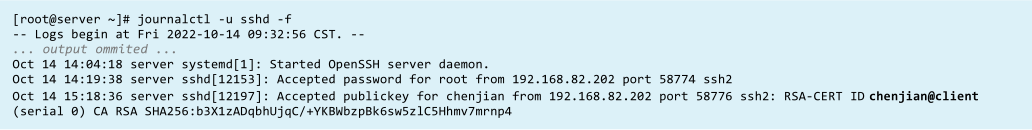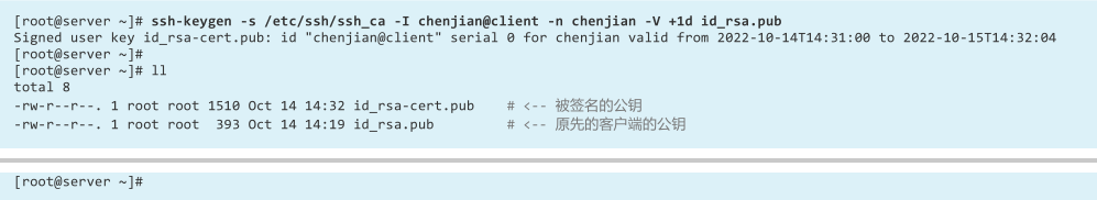 服务器: 使用自己的私钥,对客户端的公钥进行签名,并且指定仅允许客户端使用"chenjian"用户免密登录,期限为1天; 签名后,会在当前目录下生成一个新的签名公钥文件。
