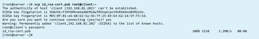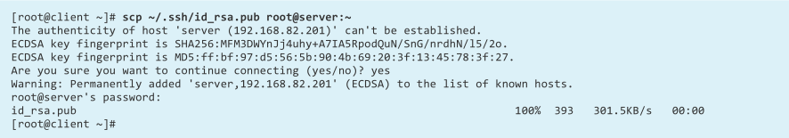 客户端: 将生成的公钥(文件默认位于 /root/.ssh/id_rsa.pub )发送给服务端; 此处由于实验环境,使用 scp 命令进行演示,工作中应该通过其他介质传输该文件(如直接把公钥文件中的内容,直接复制给服务器的管理员)